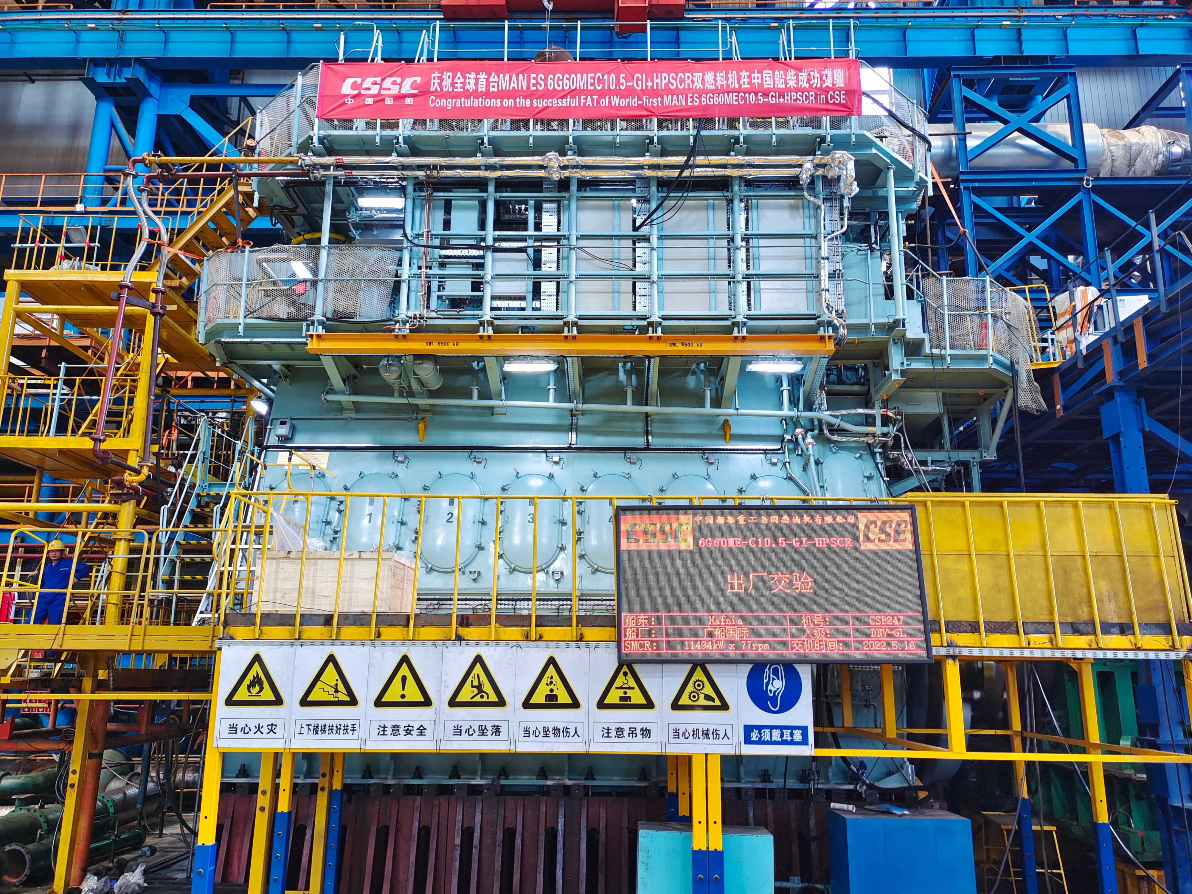 2022年5月24日,全球首台6G60MEC10.5-G+HPSCR型高压双燃料主机在青岛总装厂成功交验,该主机最大持续功率17040千瓦(2.32万马力),重493吨 ,配备公司自主研发的高压废气后处理装置,符合国际海事组织TierⅢ排放标准,将安装在广船国际为TOTAL建造的11万吨双燃料原油/成品油船上,标志着公司已具备高压双燃料主机的生产制造能力。